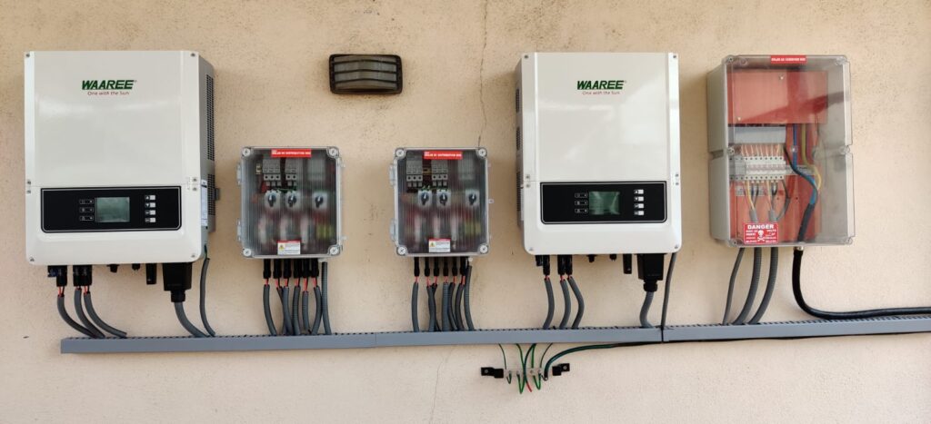 Panels, inverter, mounting structure, wiring, and monitoring setup.